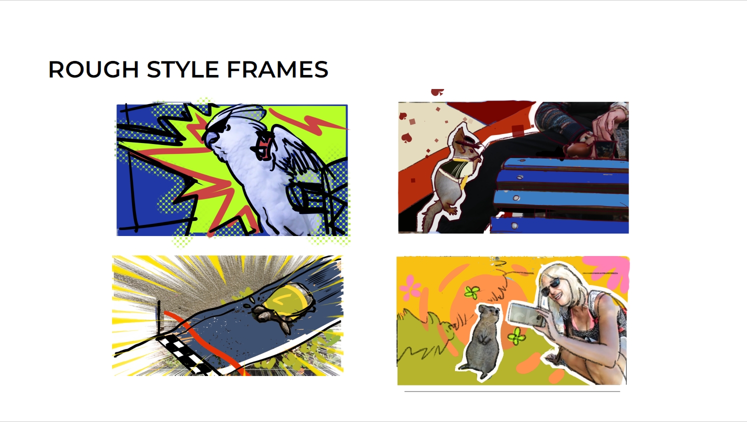 To reflect the quirky charm of urban animals, I chose a collage-inspired style combining cutout silhouettes with bold vector graphics. Each scene pairs textured creatures—like stickers peeled from real life—against energetic comic-like backgrounds. Jazz music adds a laid-back rhythm, suggesting that these city critters are not just surviving, but grooving through metropolitan life as relaxed, offbeat residents.